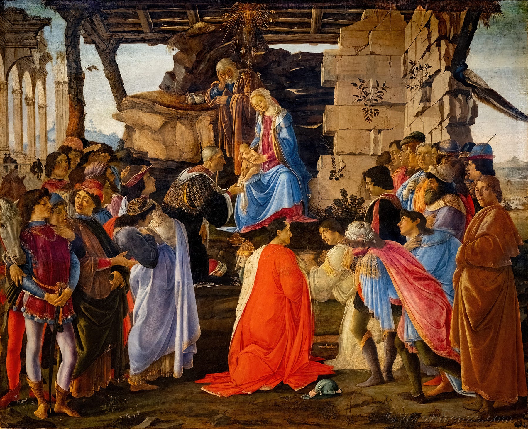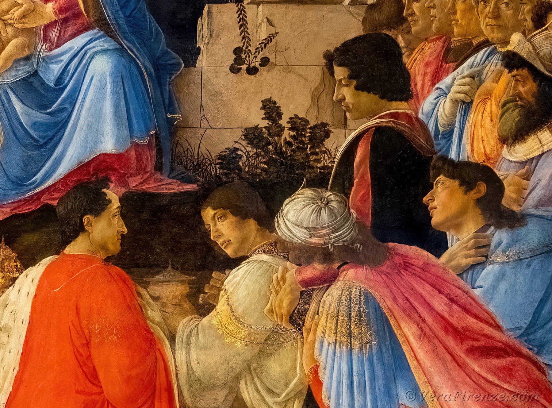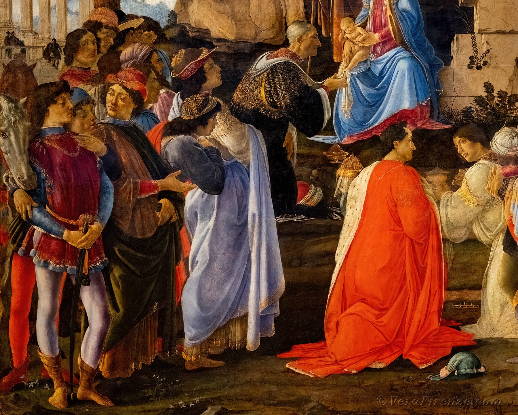 Botticelli ha infatti scelto di dare priorità visiva non alla Vergine e a Cristo, ma a coloro che sono venuti a prostrarsi davanti a lui.