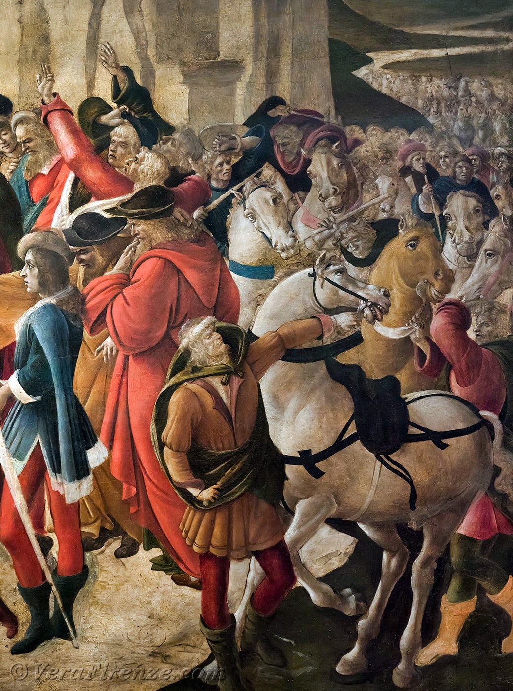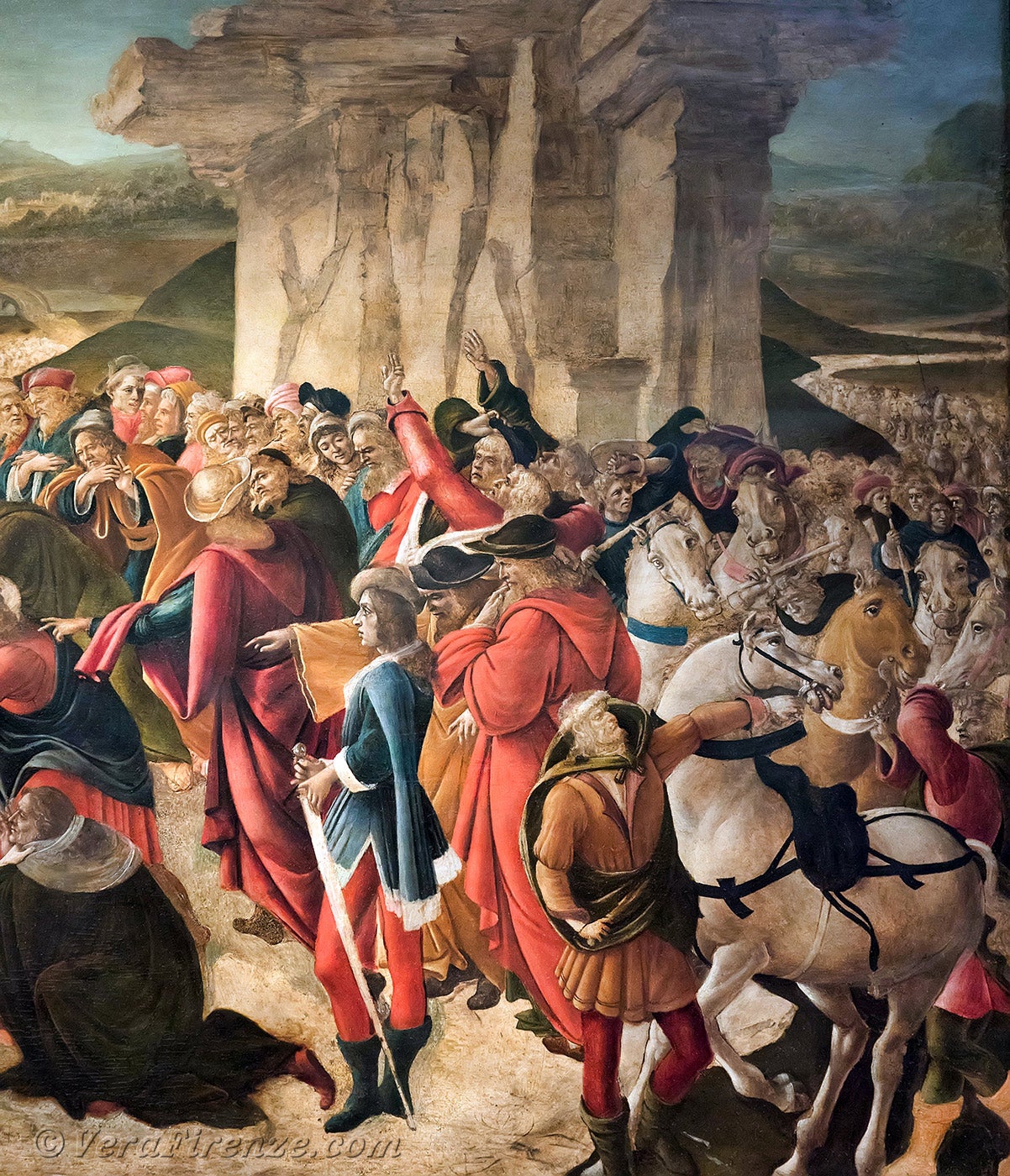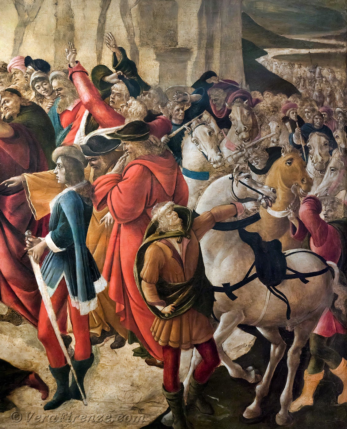 Nella parte destra del quadro, tra il personaggio vestito di blu e i cavalli impennati, si può vedere un uomo alto e dignitoso, vestito con un mantello Rosso, eretto, calmo, attento e concentrato, in contrasto con la folla che lo circonda, l'amico di Sandro Botticelli: Leonardo da Vinci.