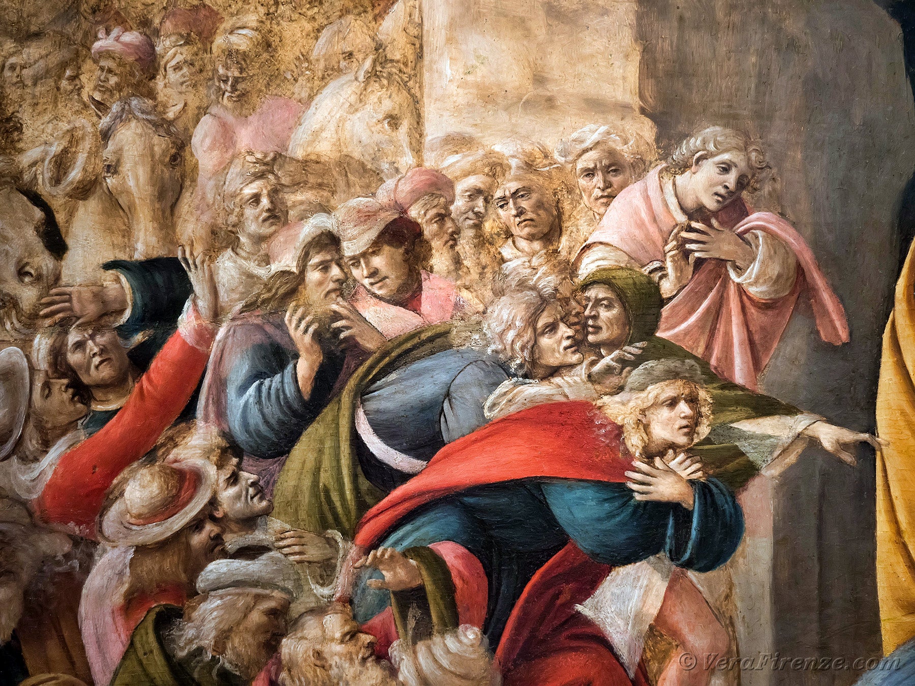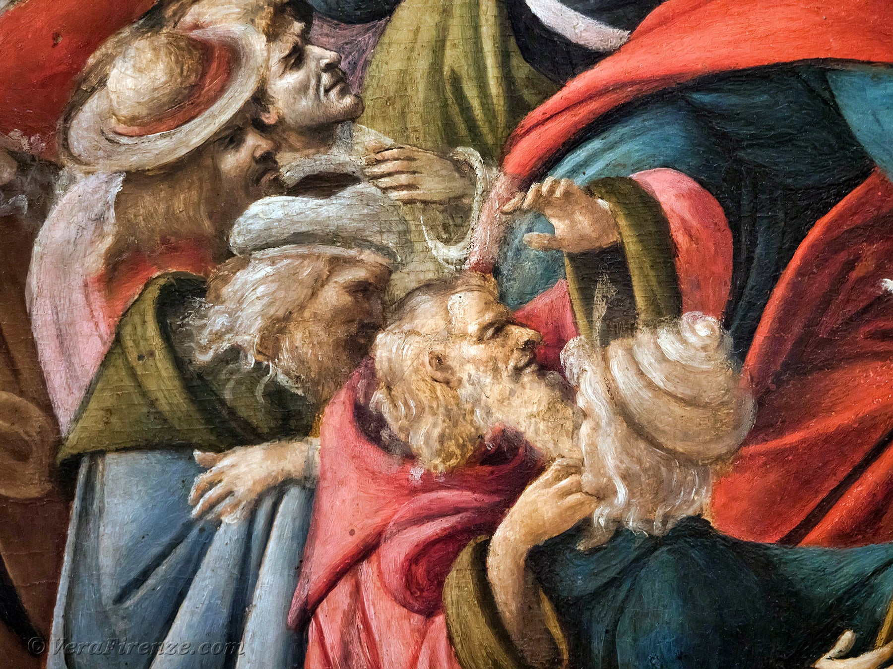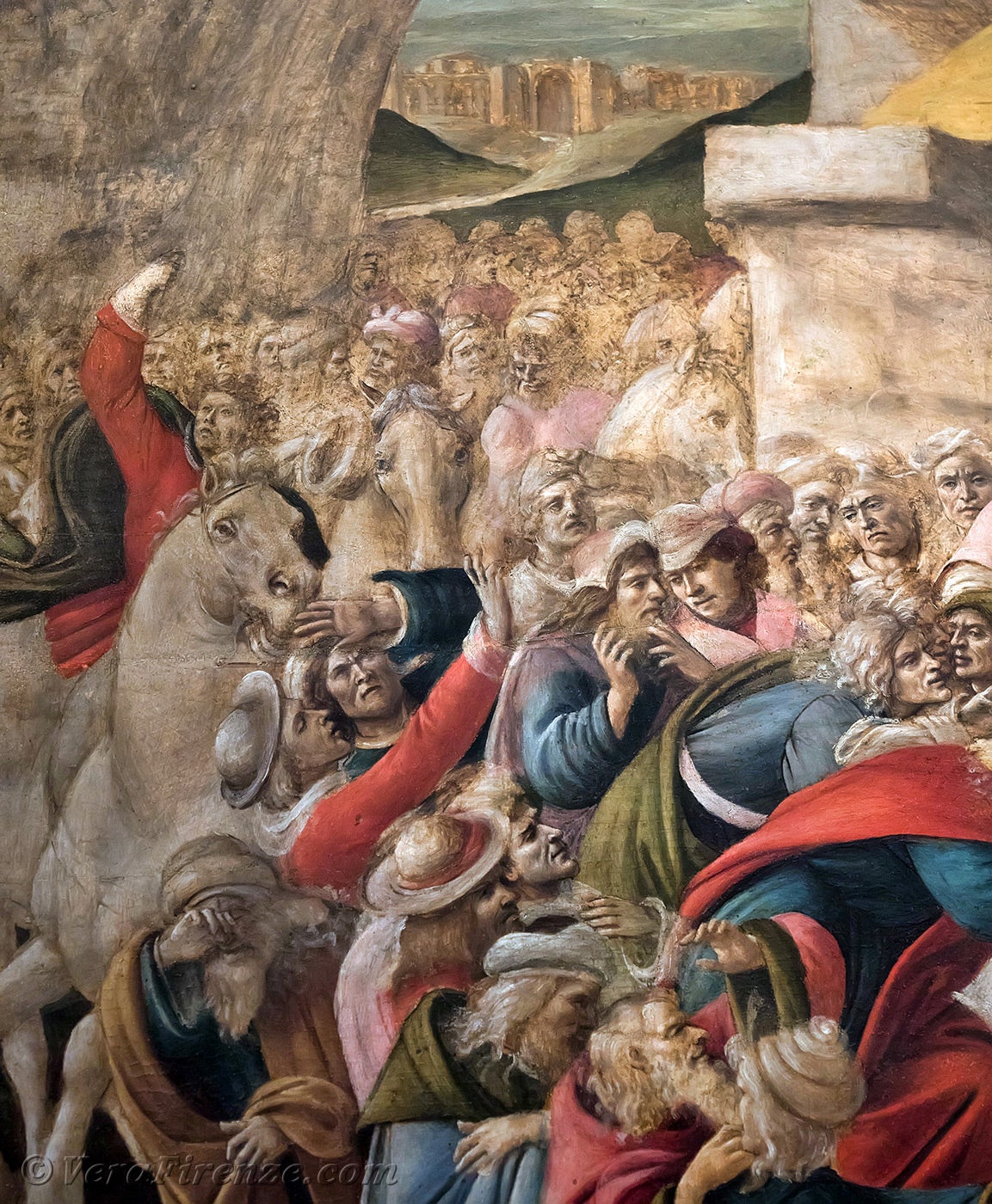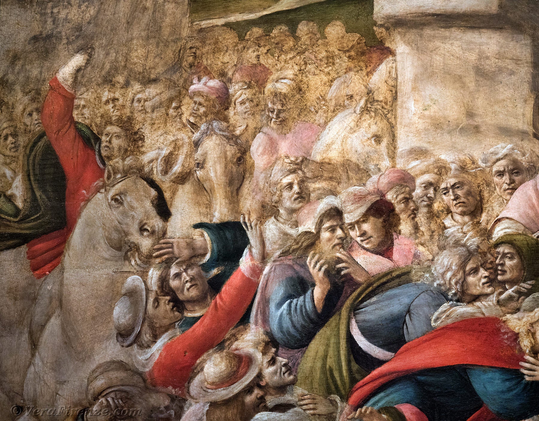 Nella parte destra del quadro, tra il personaggio vestito di blu e i cavalli impennati, si può vedere un uomo alto e dignitoso, vestito con un mantello Rosso, eretto, calmo, attento e concentrato, in contrasto con la folla che lo circonda, l'amico di Sandro Botticelli: Leonardo da Vinci.