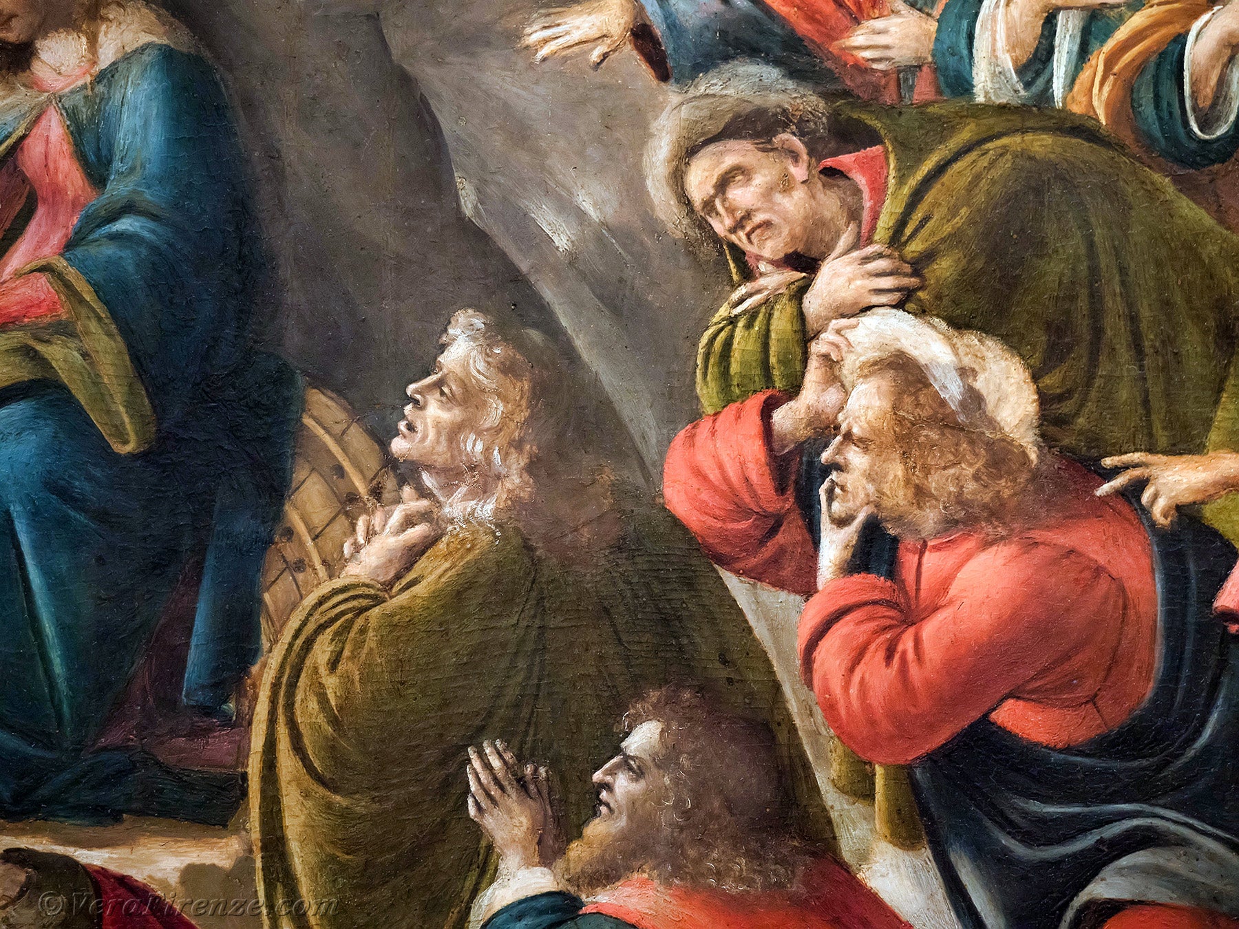 Secondo alcuni, qui si devono riconoscere gli otto capi della Signoria Fiorentina, della Repubblica di Firenze, inginocchiati e prostrati davanti a Gesù, “Il Cristo Re di Firenze” secondo la teoria di Savonarola.