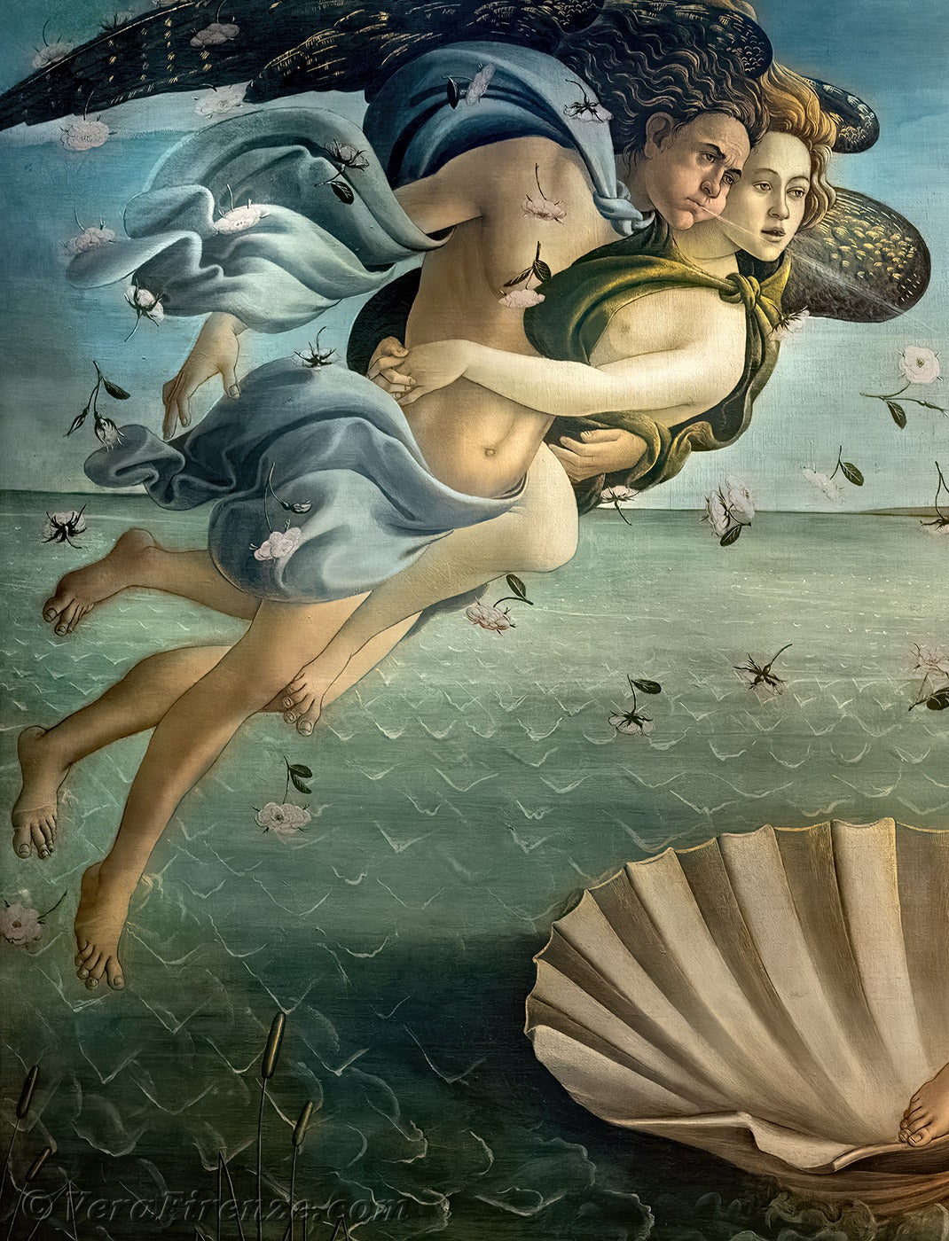 Gli amanti abbracciati, Zefiro e Aura, rappresentano il soffio della passione che spinge e ispira la dea Venere, appena nata.