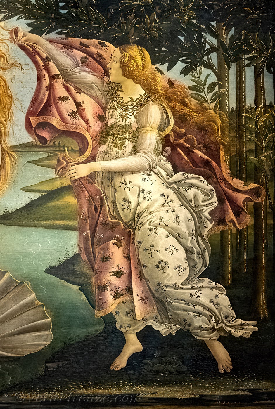 Le rose che cadono dal cielo grazie al soffio fecondante dei venti amorosi trovano il loro complemento nel mantello fiorito teso dalla giovane Ora a Venere per proteggere la sua nudità.