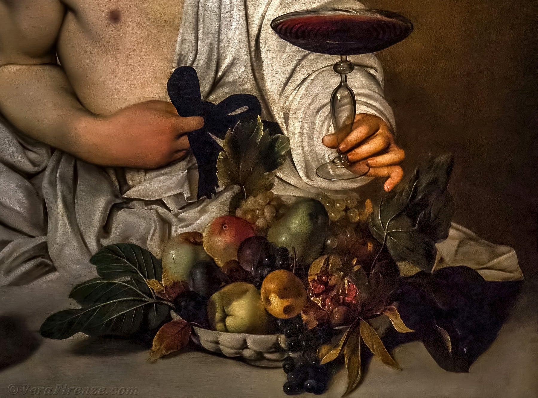 Il bicchiere di vino è stato appena riempito e, con questo gesto cordiale, Caravaggio cerca di coinvolgere lo spettatore.