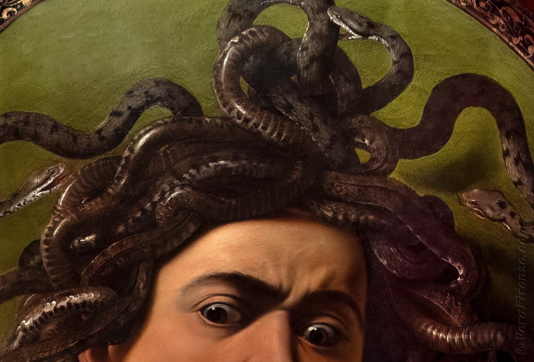 Pittura - Olio su tela e legno (55 x 55 cm) 1596-1598Caravaggio ha dipinto qui Medusa con i capelli di serpenti che trasforma in pietra chi la guarda.